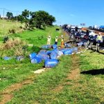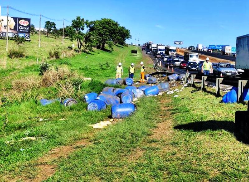 Um caminhão carregado com tripas de boi colidiu no guard rail (defensa metálica), espalhando a carga pela pista de rolamento.