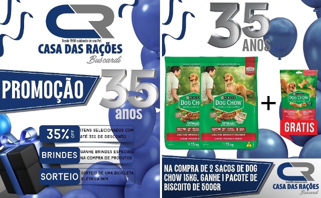 Em outubro, a Casa das Rações da Buscardi comemora 35 anos de história, sempre oferecendo o melhor atendimento para você e seu animal de estimação. Para celebrar essa data tão especial, durante todo o mês teremos SUPER PROMOÇÕES em toda a loja e BRINDES EXCLUSIVOS na compra de produtos selecionados.