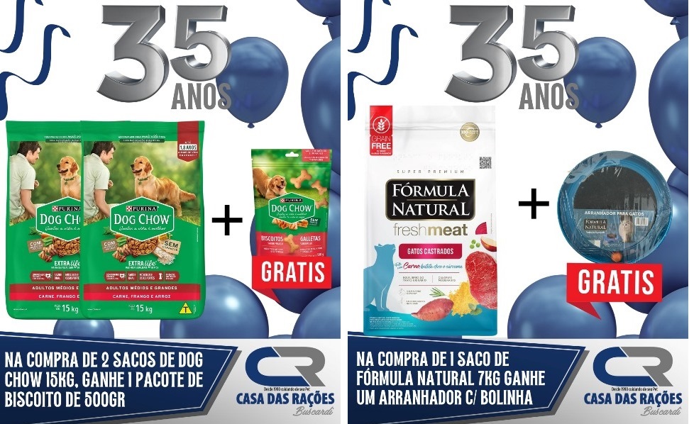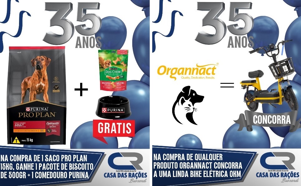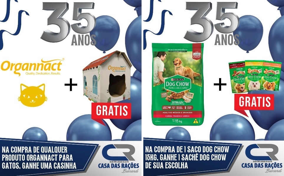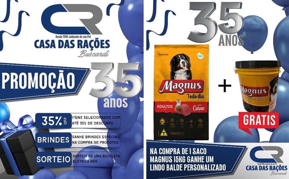 Em outubro, a Casa das Rações da Buscardi comemora 35 anos de história, sempre oferecendo o melhor atendimento para você e seu animal de estimação. Para celebrar essa data tão especial, durante todo o mês teremos SUPER PROMOÇÕES em toda a loja e BRINDES EXCLUSIVOS na compra de produtos selecionados.