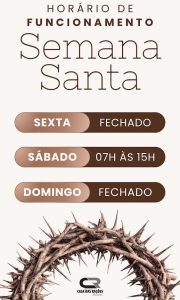 Sexta-feira 03/04 fechado, no sábado 04/04 atendimento normal das 07 às 15 horas, domingo 05/04 fechado.