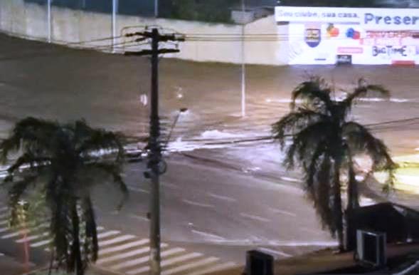 Enchente no Rio São Lourenço como a um tempo atrás, faz tempo que não acontece, mas ali na rotatória da prefeitura é um transtorno toda vez que chove.
