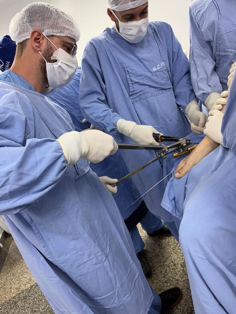 A cirurgia foi conduzida pelo ortopedista Dr. Lucas Alcaide Thomaz, profissional com experiência prévia nesse tipo de correção, e contou com o apoio de equipe anestésica especializada e a presença de diversos médicos ortopedistas, que acompanharam o procedimento de forma técnica e observacional.