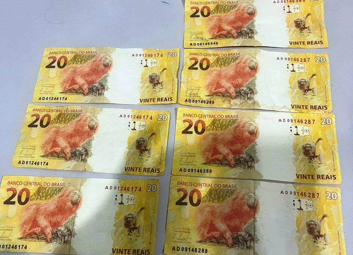 Na abordagem, foi encontrado com o indivíduo 7 notas falsas de R$ 20,00 totalizando R$ 140,00 fraudulentos