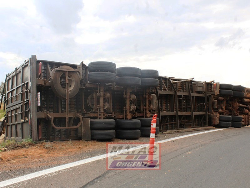 A carreta caçamba trafegava carregada com bagacinho, rumo a uma empresa em Matão, ao tomar a alça de acesso para a Avenida Marchesan acabou tombando.