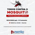 A Prefeitura de Matão, por meio da Secretaria Municipal de Saúde, realizará nesta quinta-feira, dia 15, mais um Mutirão de Combate ao Aedes aegypti, mosquito transmissor da dengue, chikungunya e zika.