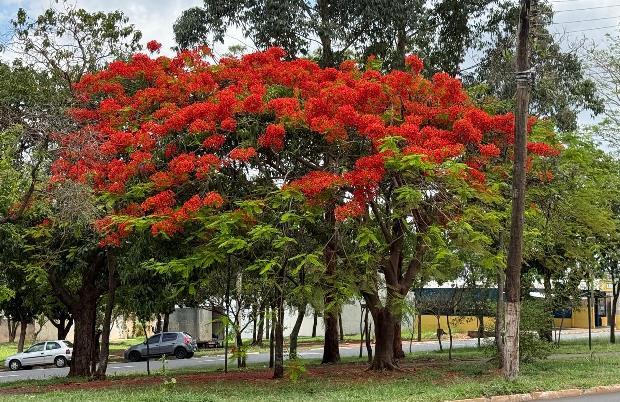 Em plena primavera, os flamboyants desfilam sua exuberância, pintando de vermelho vibrante o canteiro central da Avenida Francisco Mastropietro em Matão.
