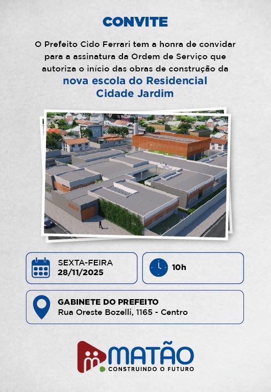O prefeito Cido Ferrari assina, nesta sexta-feira (28/11), às 10h, em seu gabinete, a ordem de serviço para a construção de uma nova escola no Residencial Cidade Jardim, região que vem registrando expressivo crescimento populacional nos últimos anos.