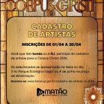 O ‘Cadastro de Artistas’ visa abrir oportunidade a todas as Bandas e Djs de Matão e região, a participarem de um processo seletivo, para escolha das atrações que se apresentarão na noite de 03 e no dia 04 de junho, sendo parte da programação de Corpus Christ 2026. O objetivo é valorizar artistas destacados no município e região, bem como revelar novos talentos.