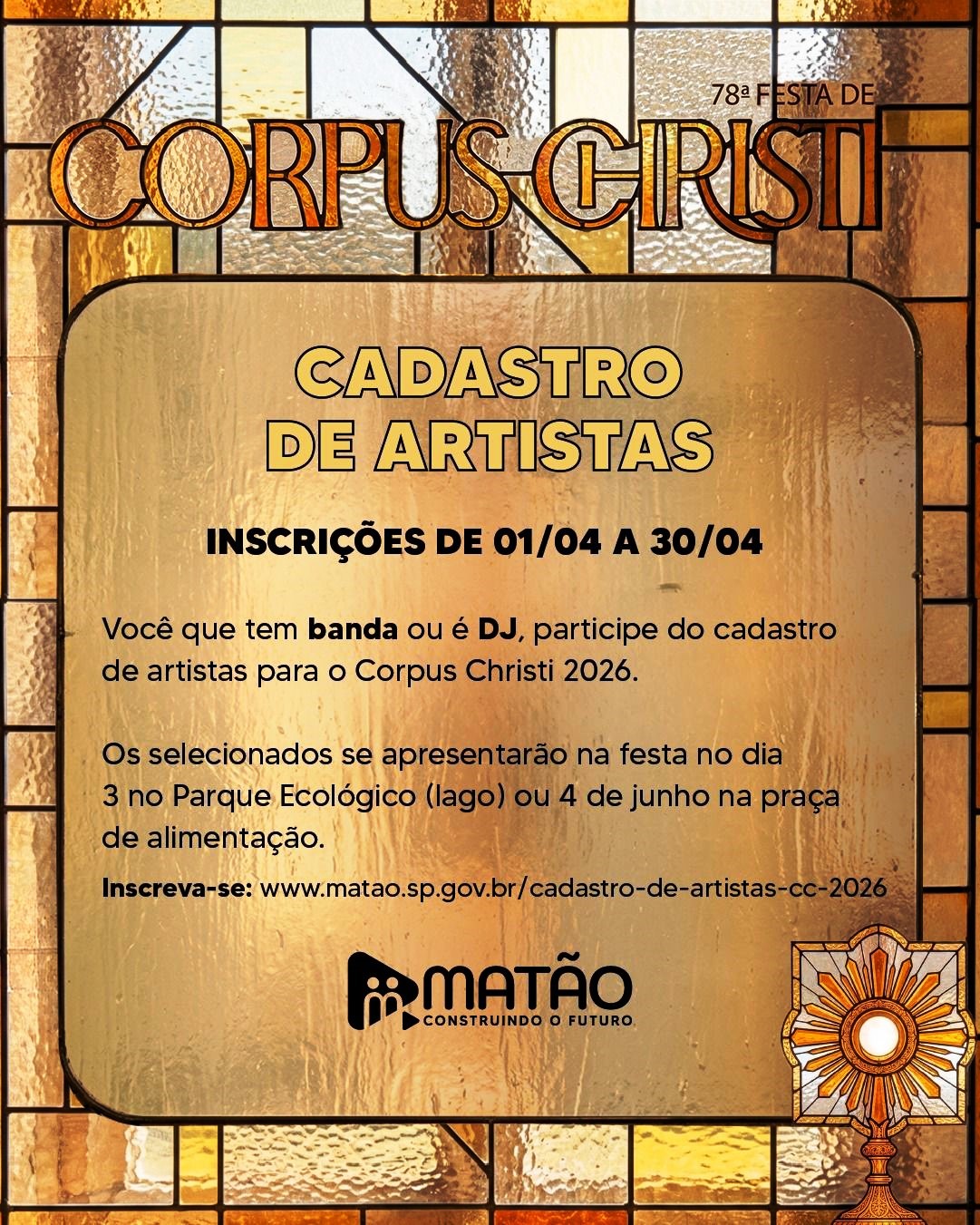 O ‘Cadastro de Artistas’ visa abrir oportunidade a todas as Bandas e Djs de Matão e região, a participarem de um processo seletivo, para escolha das atrações que se apresentarão na noite de 03 e no dia 04 de junho, sendo parte da programação de Corpus Christ 2026. O objetivo é valorizar artistas destacados no município e região, bem como revelar novos talentos.