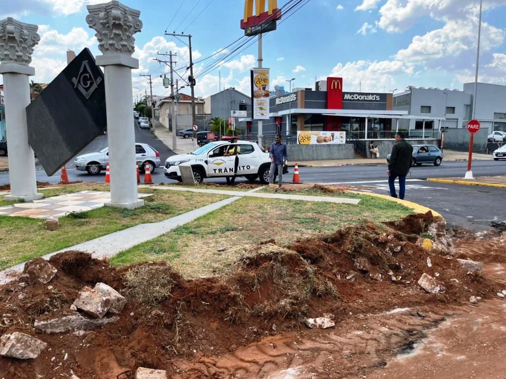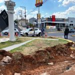 Delimitação da Rotatória ‘Loja Maçônica Terra da Saudade’ – Avenida Padre Nelson – Centro – o objetivo é aumentar o espaço das vias e melhorar a fluidez do trânsito de veículos.