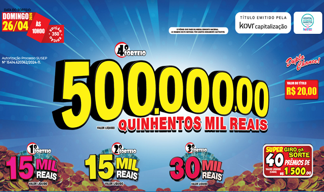 4º Sorteio – R$ 500.000,00 (Quinhentos Mil Reais).