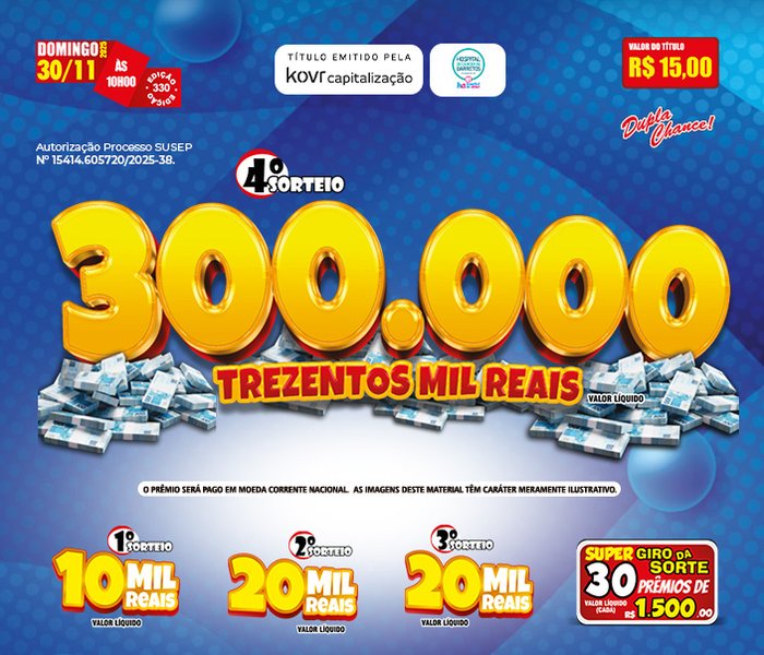 4º Sorteio – R$ 300.000,00 (Trezentos Mil Reais).