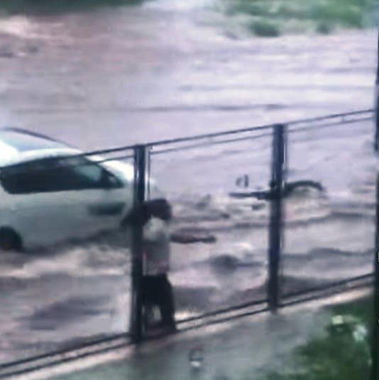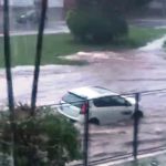 No cruzamento da Rua Sinharinha Frota com a Avenida Padre Nelson, a enxurrada arrastou moto e deixou carro ilhado.